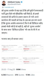 अखिलेश यादव ने अपने एक्स हैंडल पर इससे जुड़ा एक पोस्ट किया है. अखिलेश यादव ने अपने पोस्ट में लिखा, ‘जो चुनाव आयोग ये कह रहा है कि हमें यूपी में समाजवादी पार्टी द्वारा दिये गये ऐफ़िडेविट नहीं मिले हैं, वो हमारे शपथपत्रों की प्राप्ति के प्रमाण स्वरूप दी गयी अपने कार्यालय की पावती को देख ले. इस बार हम मांग करते हैं कि चुनाव आयोग शपथपत्र दे कि ये जो डिजिटल रसीद हमको भेजी गयी है वो सही है, नहीं तो ‘चुनाव आयोग’ के साथ-साथ ‘डिजिटल इंडिया’ भी शक के घेरे में आ जाएगा. भाजपा जाए तो सत्यता आए!’